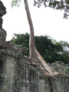 Ces arbres géants s’enroulent sur les pierres et se dressent majestueux à plus de 50m de hauteur. Au fil des années, leurs racines ont pris possession des temples et on ne sait plus bien si on se trouve au milieu de la jungle ou dans un ancien temple khmer.