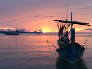 Mais c’est vrai que le lieu est paradisiaque : soleil, lumière et couchers de soleil exceptionnels, plages, cote rocheuse, golf à flanc de colline et dominant la mer (si, si …), cours de cuisine Thai dans un potager organique dans la montagne, gentillesse des gens partout, massages à domicile. Nous avons même expérimenté les soins médicaux sur place, après que Margaux se soit blessée à la plage !